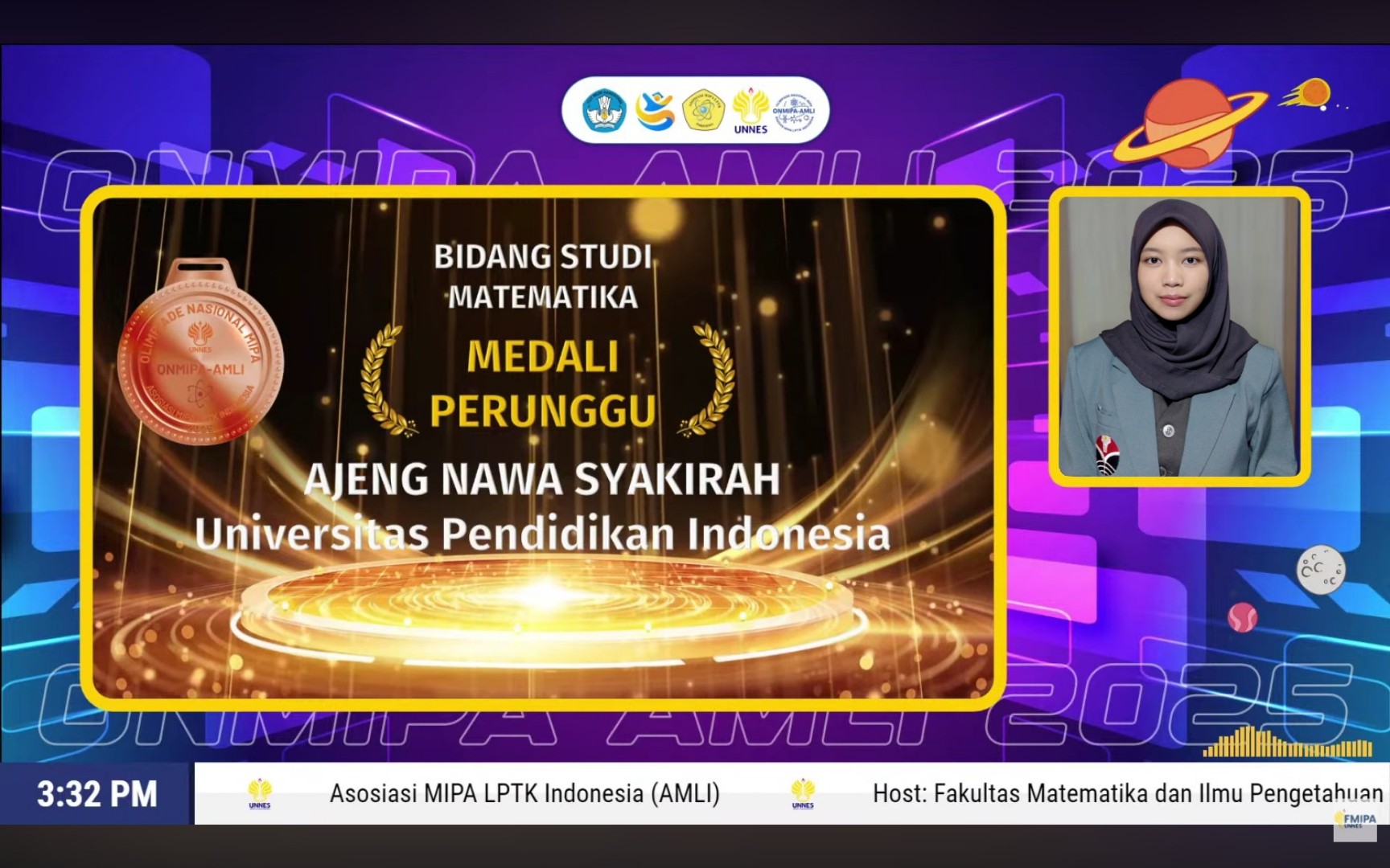 Bandung, October 30, 2025 – The Study Program of Mathematics, Universitas Pendidikan Indonesia (Indonesia University of Education, UPI), proudly announces the remarkable achievement of one of its students, Ajeng Nawa Syakirah, who won a bronze medal in the Mathematics category at the 2025 ONMIPA AMLI (National Olympiad of Mathematics and Natural Sciences).
