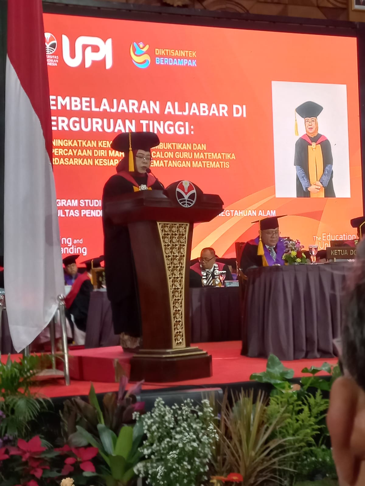 At the inauguration, Prof. Dr. Elah Nurlaelah, M.Si. delivered a speech entitled “Learning Algebra in Higher Education: Improving the Ability to Prove and Self-Confidence of Prospective Mathematics Teacher Students Based on Mathematical Readiness and Maturity”.