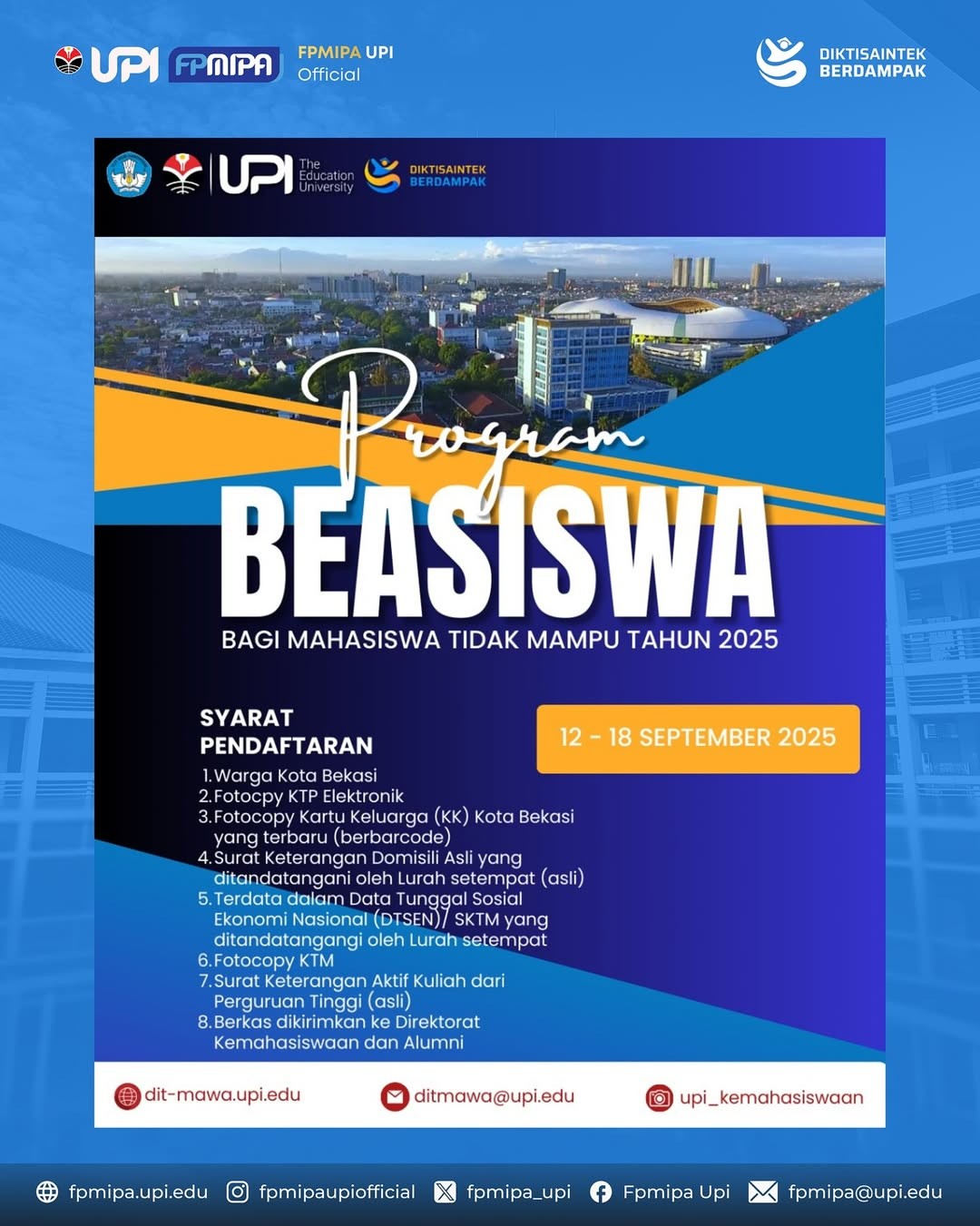 Universitas Pendidikan Indonesia (UPI), through the Directorate of Student Affairs and Alumni, has opened the 2025 Scholarship Program for Underprivileged Students. This program is specifically intended for students residing in Bekasi City as part of UPI’s commitment to supporting the continuity of education for those facing economic challenges.