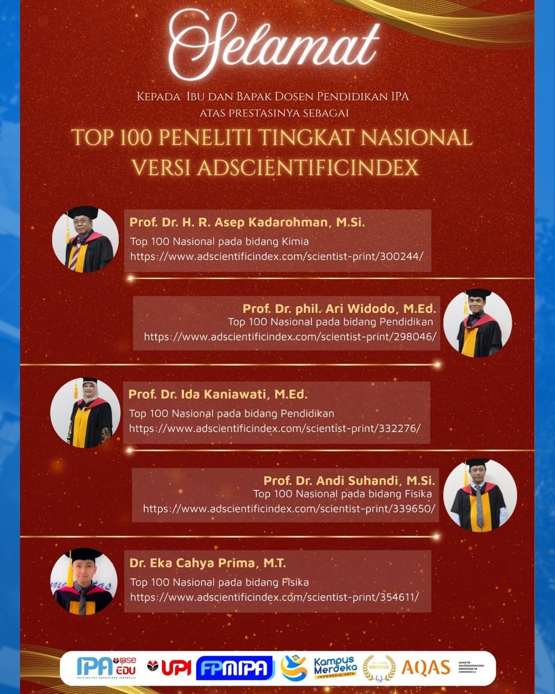 The Faculty of Mathematics and Science Education, Universitas Pendidikan Indonesia (FPMIPA UPI), proudly extends its highest appreciation to the Science Education lecturers who have achieved remarkable recognition as part of the Top 100 Researchers in Indonesia, according to the Adscientificindex.