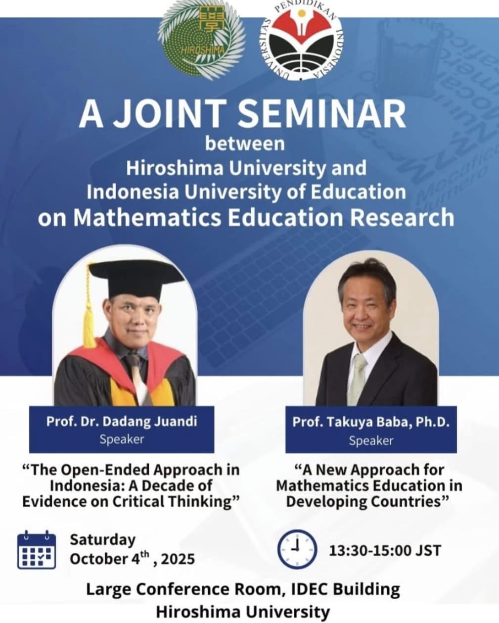 A joint seminar between Hiroshima University, Japan, and Universitas Pendidikan Indonesia was held on Saturday, October 4, 2025, at the Large Conference Room, IDEC Building, Hiroshima University.